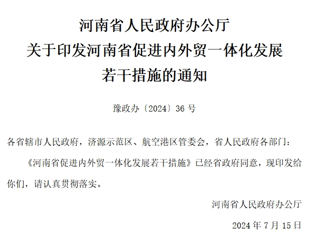 河南省人民政府辦公廳 關(guān)于印發(fā)河南省促進(jìn)內(nèi)外貿(mào)一體化發(fā)展 若