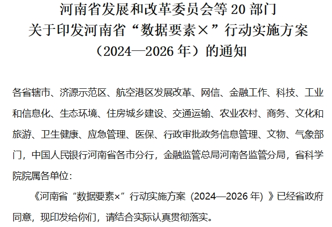 河南省發(fā)展和改革委員會(huì)等20部門(mén) 關(guān)于印發(fā)河南省“數(shù)據(jù)要素×