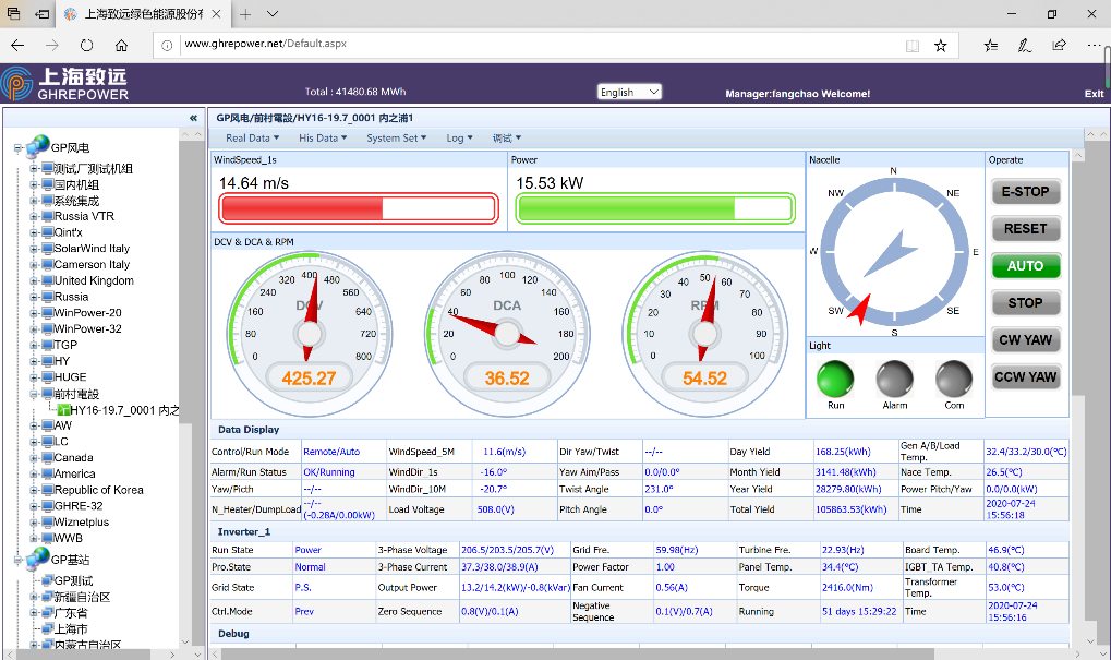 監(jiān)測功能可以實時監(jiān)測風機的運行狀態(tài),包括:風速、功率、葉輪轉(zhuǎn)速、發(fā)電量、偏航角、風向、機艙溫度、風向角、偏航角度等狀態(tài)量,風機的當前狀態(tài)(正常、風機故障、通訊故障),動作和故障記錄,同時可以對全場進行監(jiān)控。